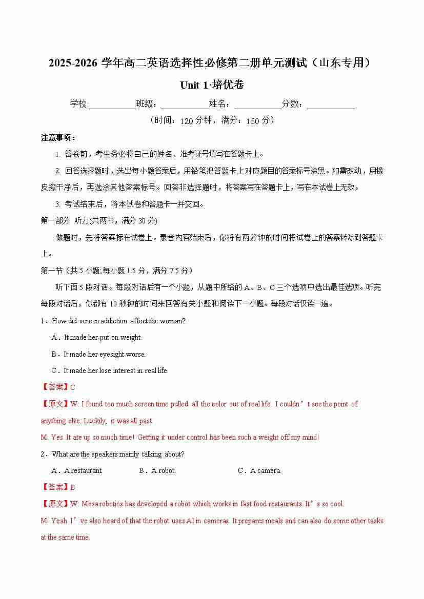 首页 > 全部 > 单元地区卷 > 高二英语选择性必修第二册 Unit 1 单元测试·山东专用(教师版)