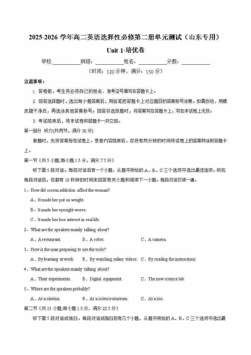 首页 > 全部 > 单元地区卷 > 高二英语选择性必修第二册 Unit 1 单元测试·山东专用(考试版A4)