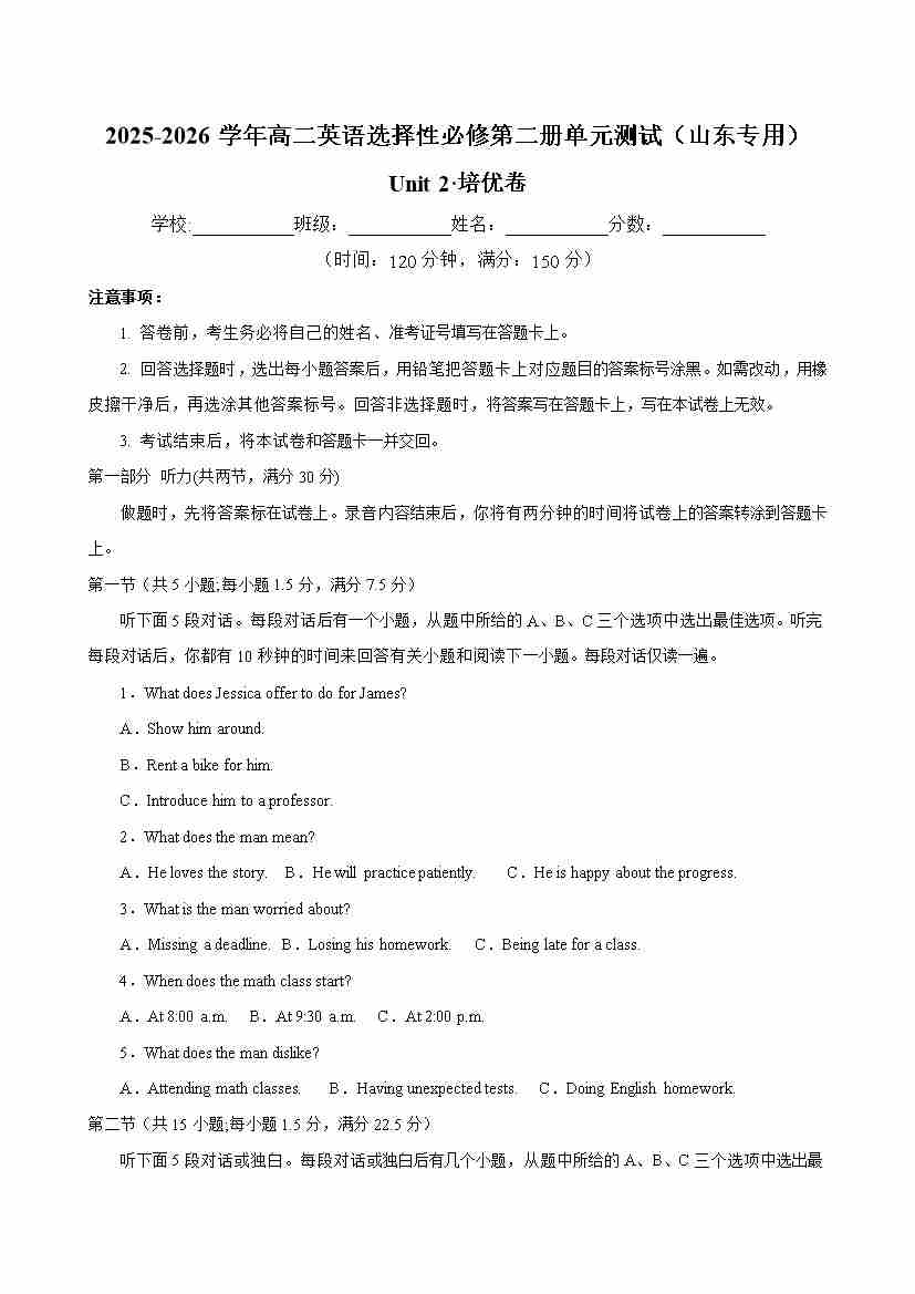 首页 > 全部 > 单元地区卷 > 高二英语选择性必修第二册 Unit 2 单元测试·山东专用(考试版A4)