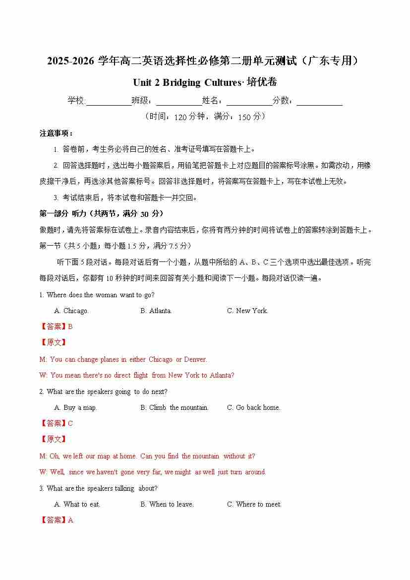 首页 > 全部 > 单元地区卷 > 高二英语选择性必修第二册Unit 2 Bridging Cultures 单元测试·广东专用(教师版)