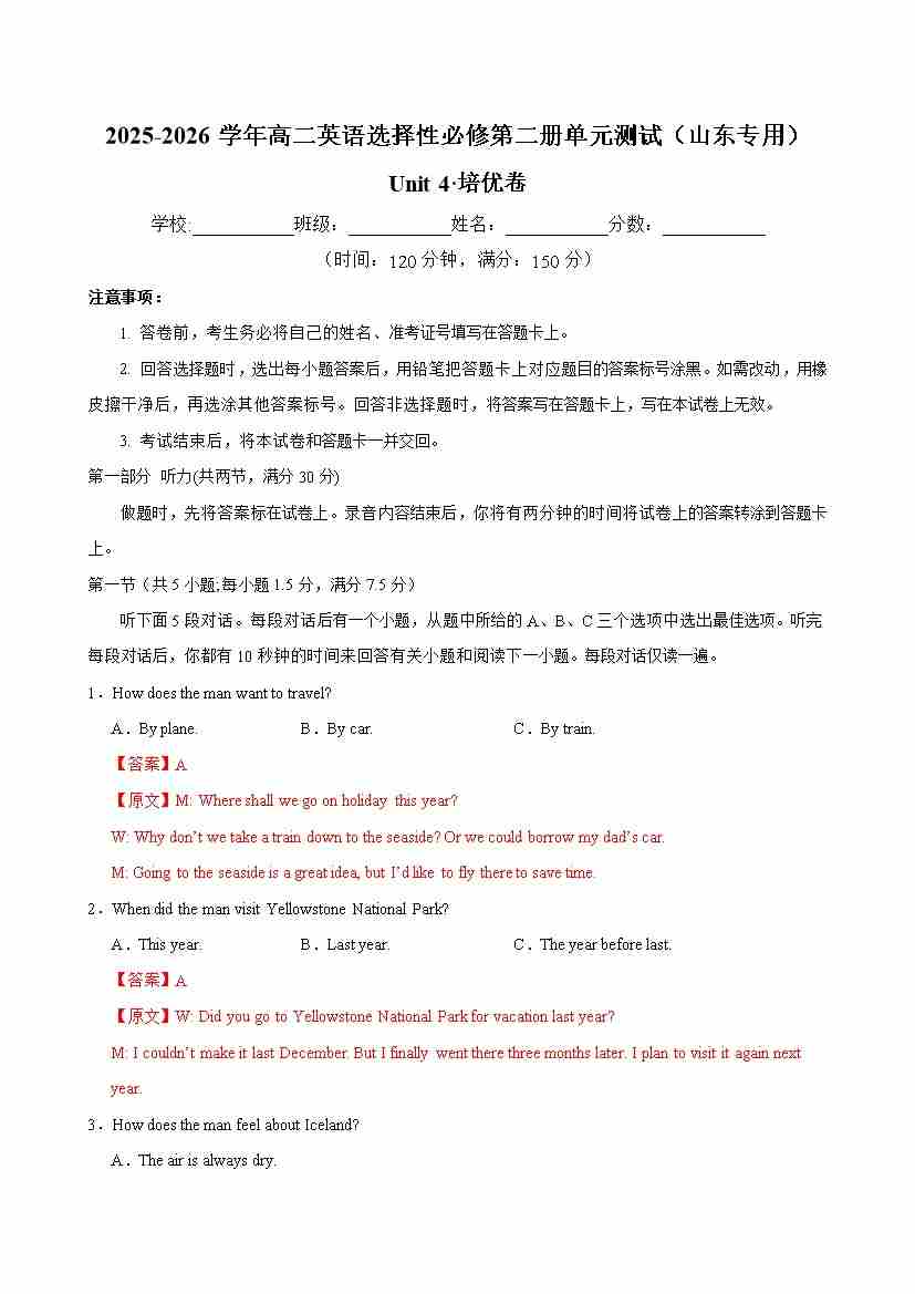首页 > 全部 > 单元地区卷 > 高二英语选择性必修第二册 Unit 4 单元测试·山东专用(教师版)