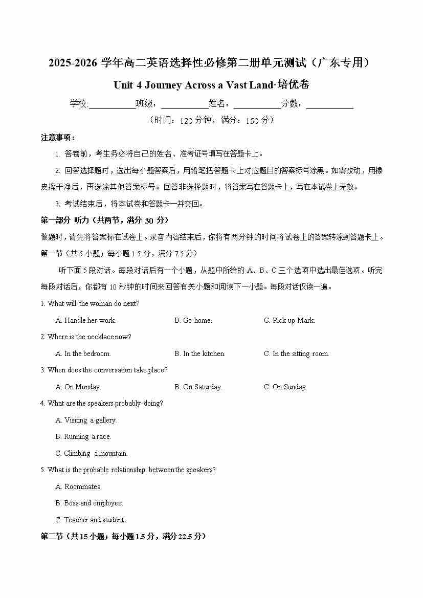 首页 > 全部 > 单元地区卷 > 高二英语选择性必修第二册Unit 4 Journey Across a Vast Land 单元测试·广东专用(考试版A4)
