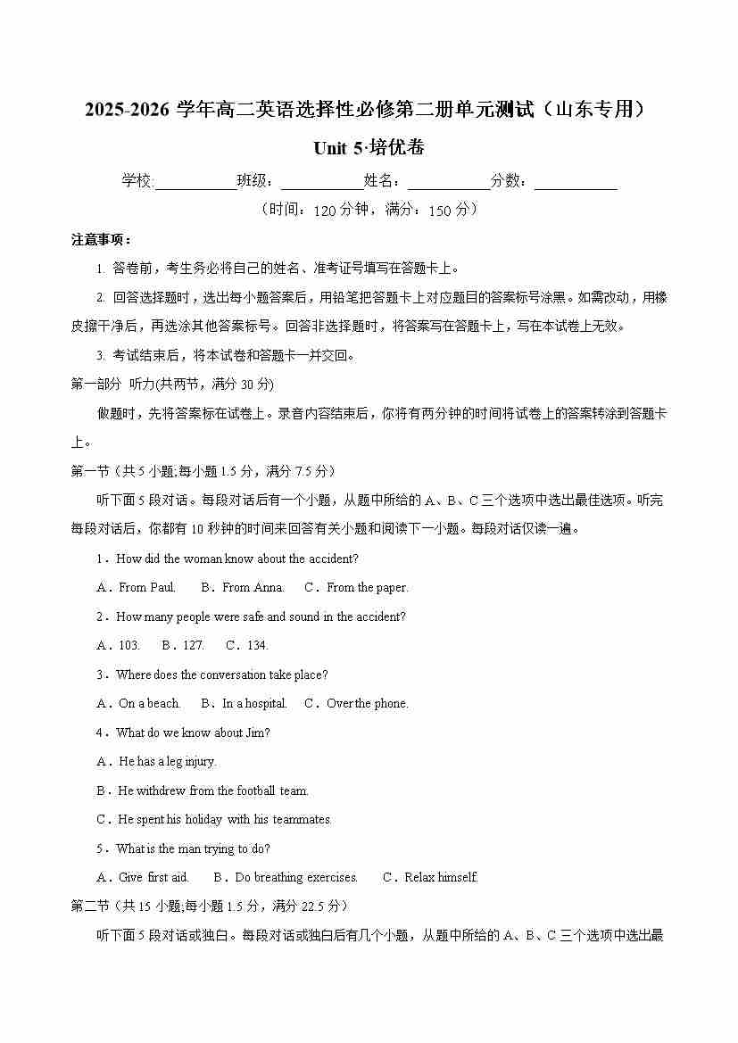 首页 > 全部 > 单元地区卷 > 高二英语选择性必修第二册 Unit 5 单元测试·山东专用(考试版A4)