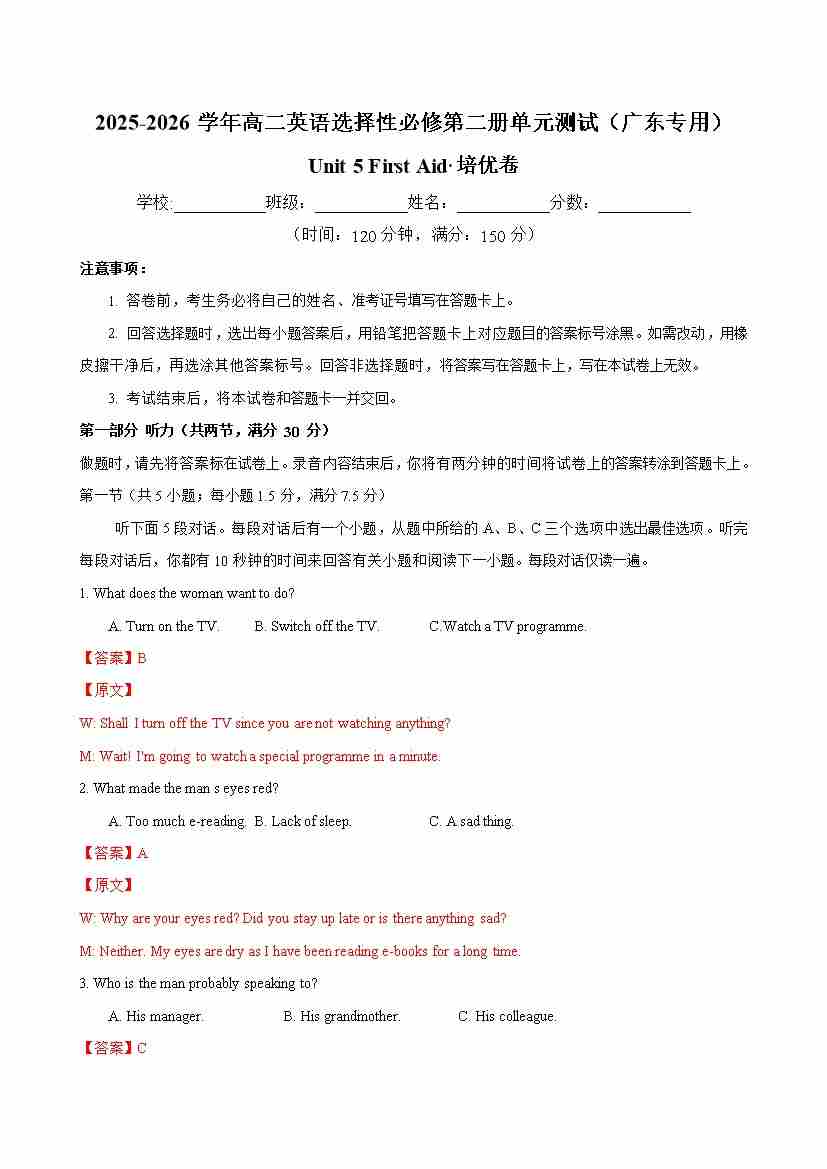 首页 > 全部 > 单元地区卷 > 高二英语选择性必修第二册Unit 5 First Aid 单元测试·广东专用(教师版)