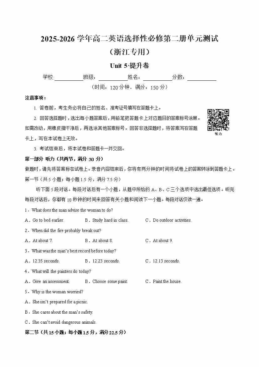 首页 > 全部 > 单元地区卷 > 高二英语选择性必修第二册Unit 5单元测试·浙江专用(考试版A4)