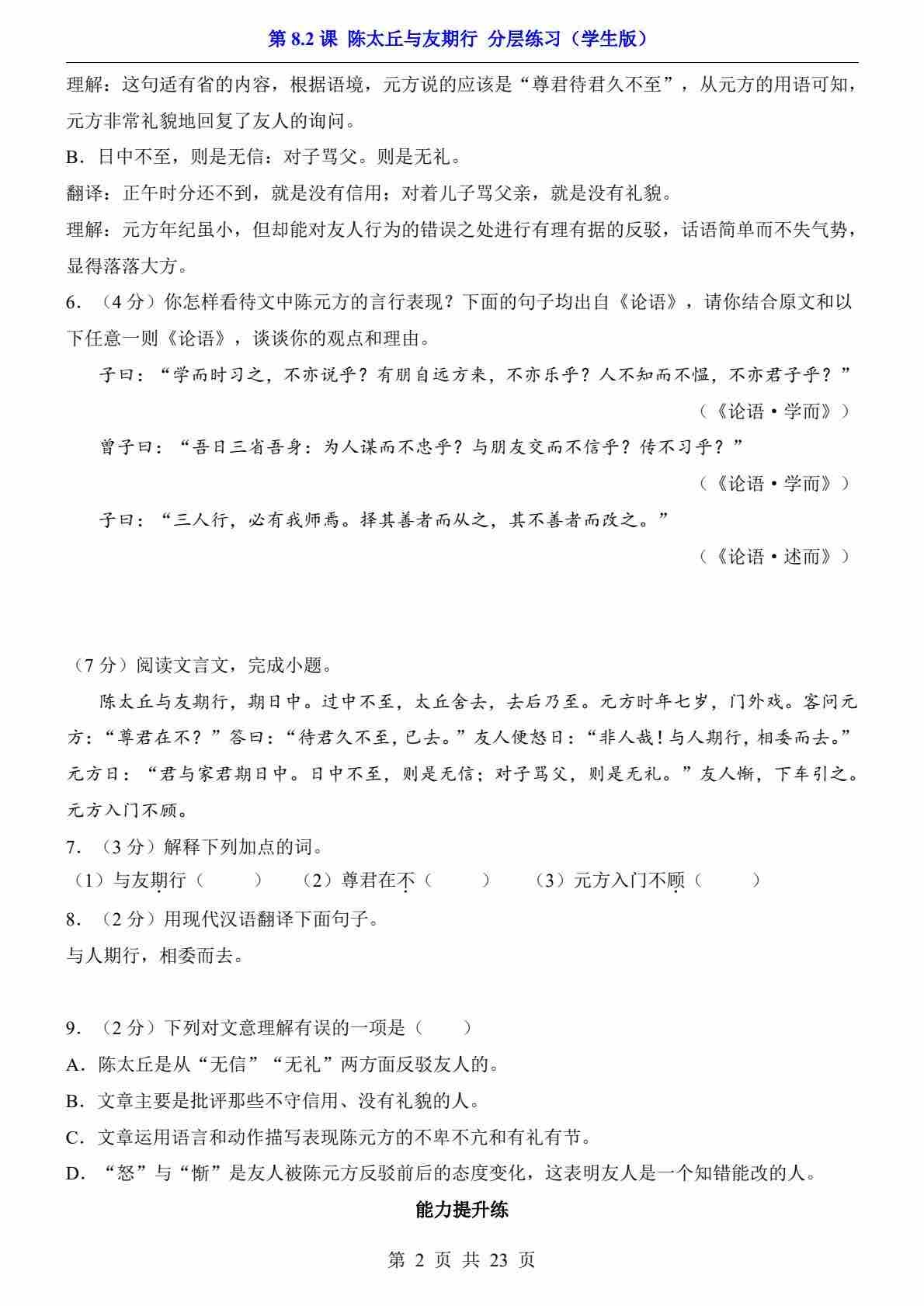 第8.2课 陈太丘与友期行(分层练习)