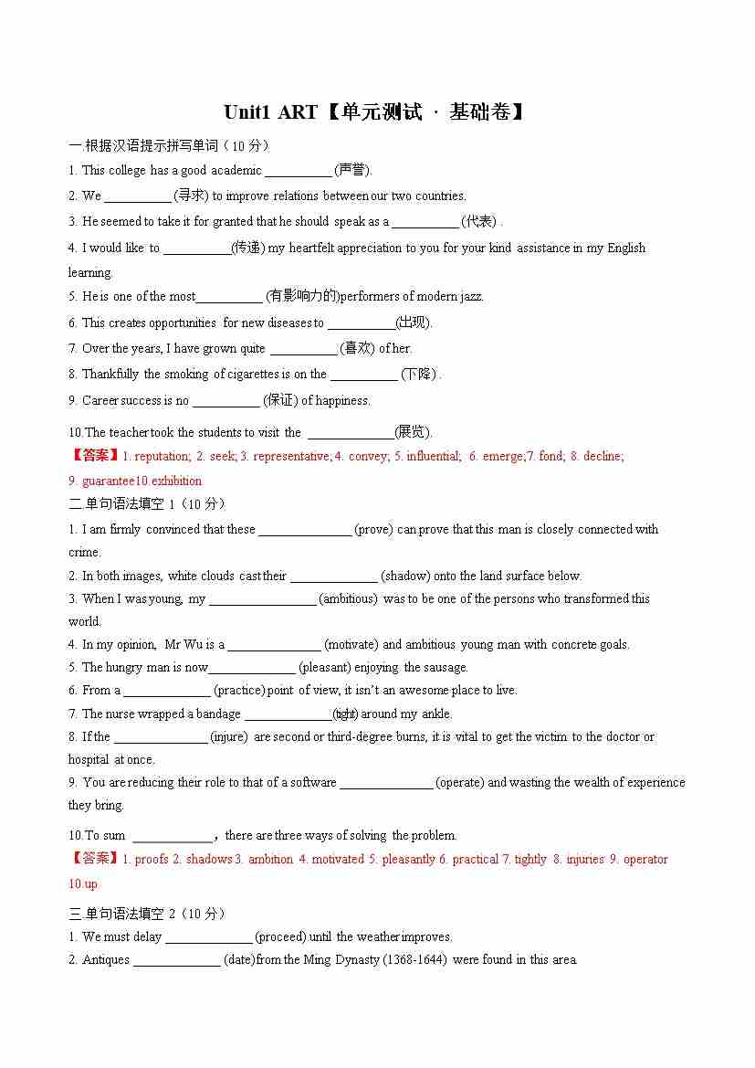 Unit1 ART(单元测试 · 基础卷)(教师版)
