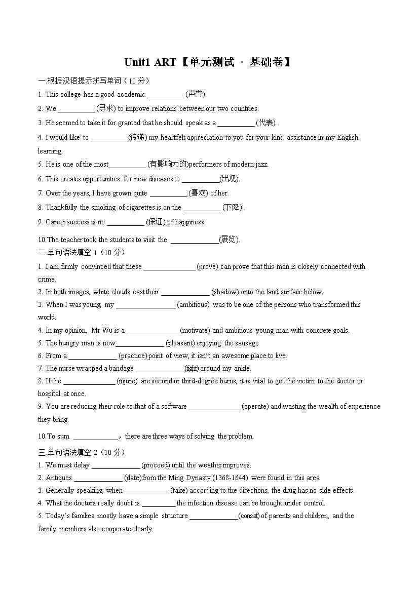 首页 > 全部 > 单元测试 > Unit1 ART(单元测试 · 基础卷)(学生版)
