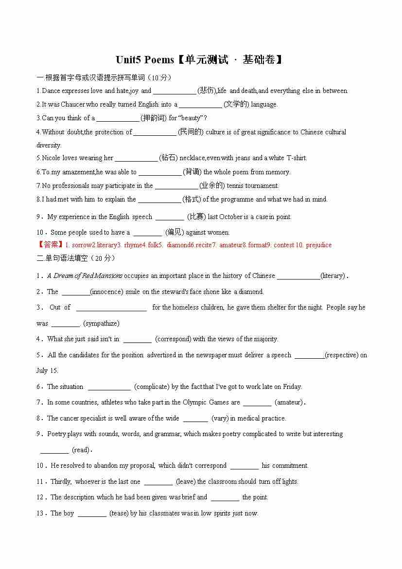 Unit 5 Poems(单元测试 · 基础卷)(教师版)