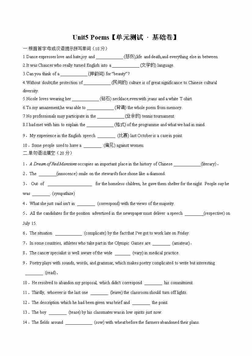 Unit 5 Poems(单元测试 · 基础卷)(学生版)