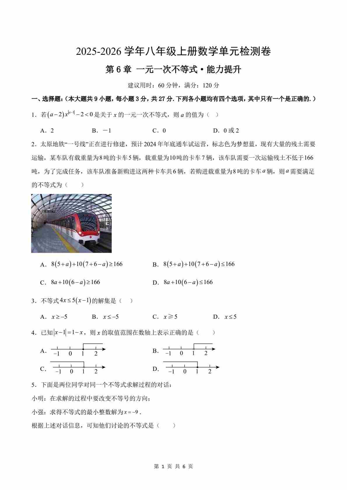 第6章 一元一次不等式测试·提升卷(考试版A4)