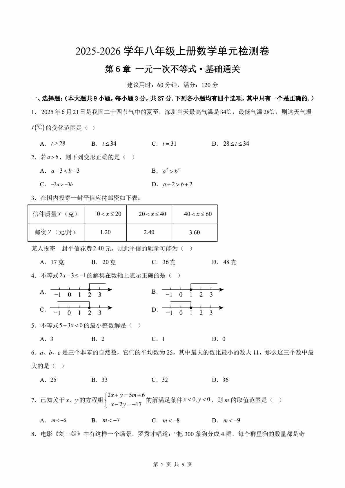首页 > 全部 > 单元测试 > 第6章 一元一次不等式测试·基础卷(考试版A4)