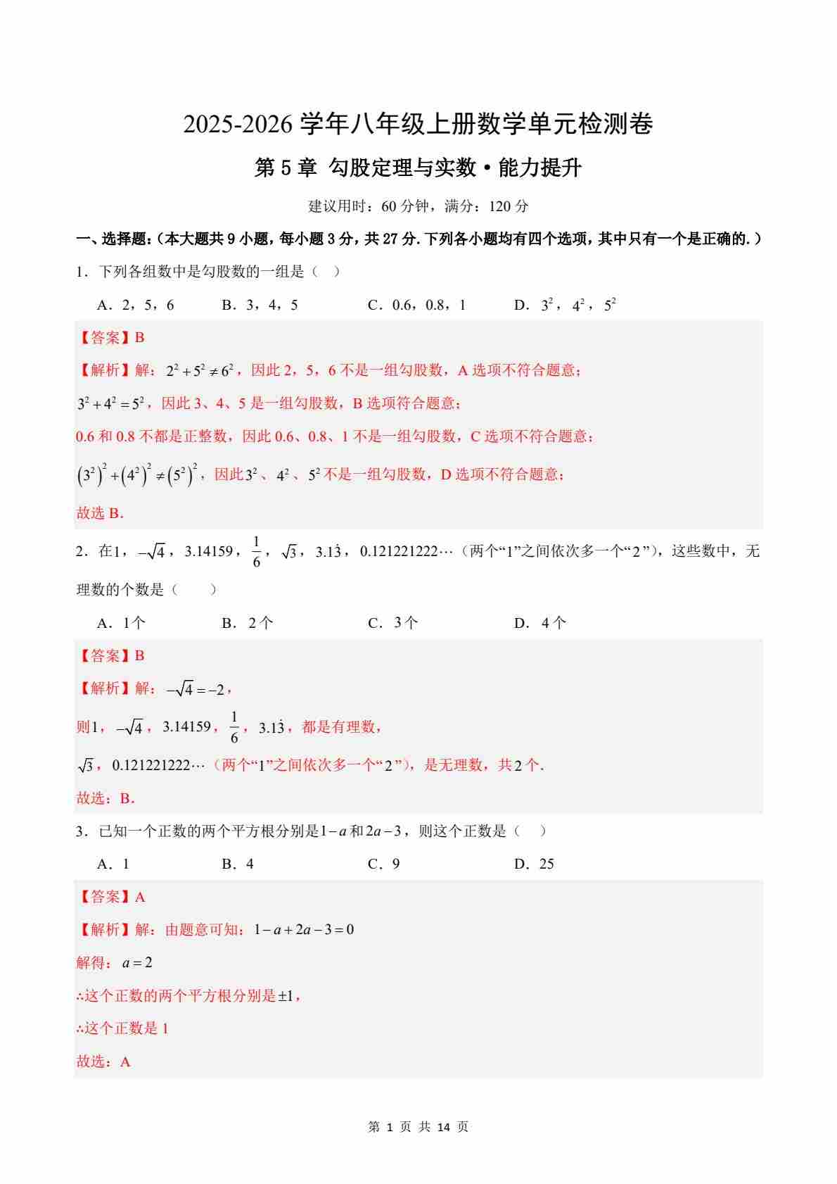 首页 > 全部 > 单元测试 > 第5章 勾股定理与实数测试·提升卷(解析版)