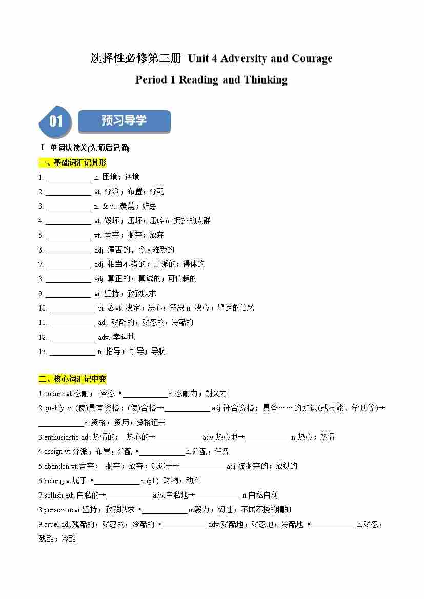 Unit 4 Adversity and Courage:Period 1 Reading and Thinking(学案)(学生版)-(人教版选择性必修第三册)