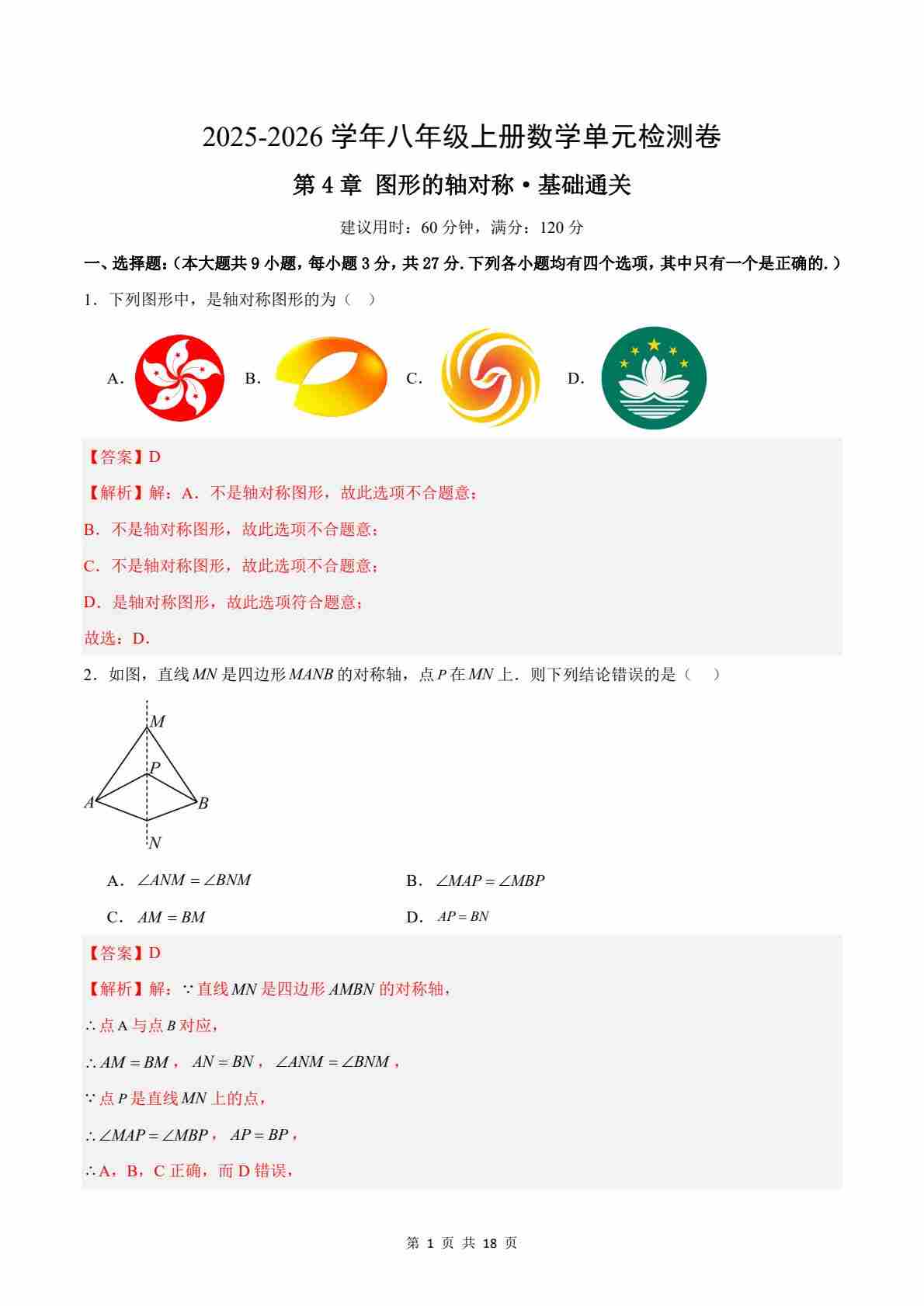 首页 > 全部 > 单元测试 > 第4章 图形的轴对称测试·基础卷(解析版)