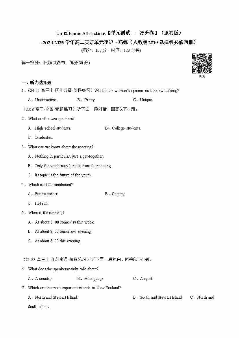 首页 > 全部 > 单元测试 > Unit2 lconic Attractions(单元测试 · 提升卷)(学生版)-