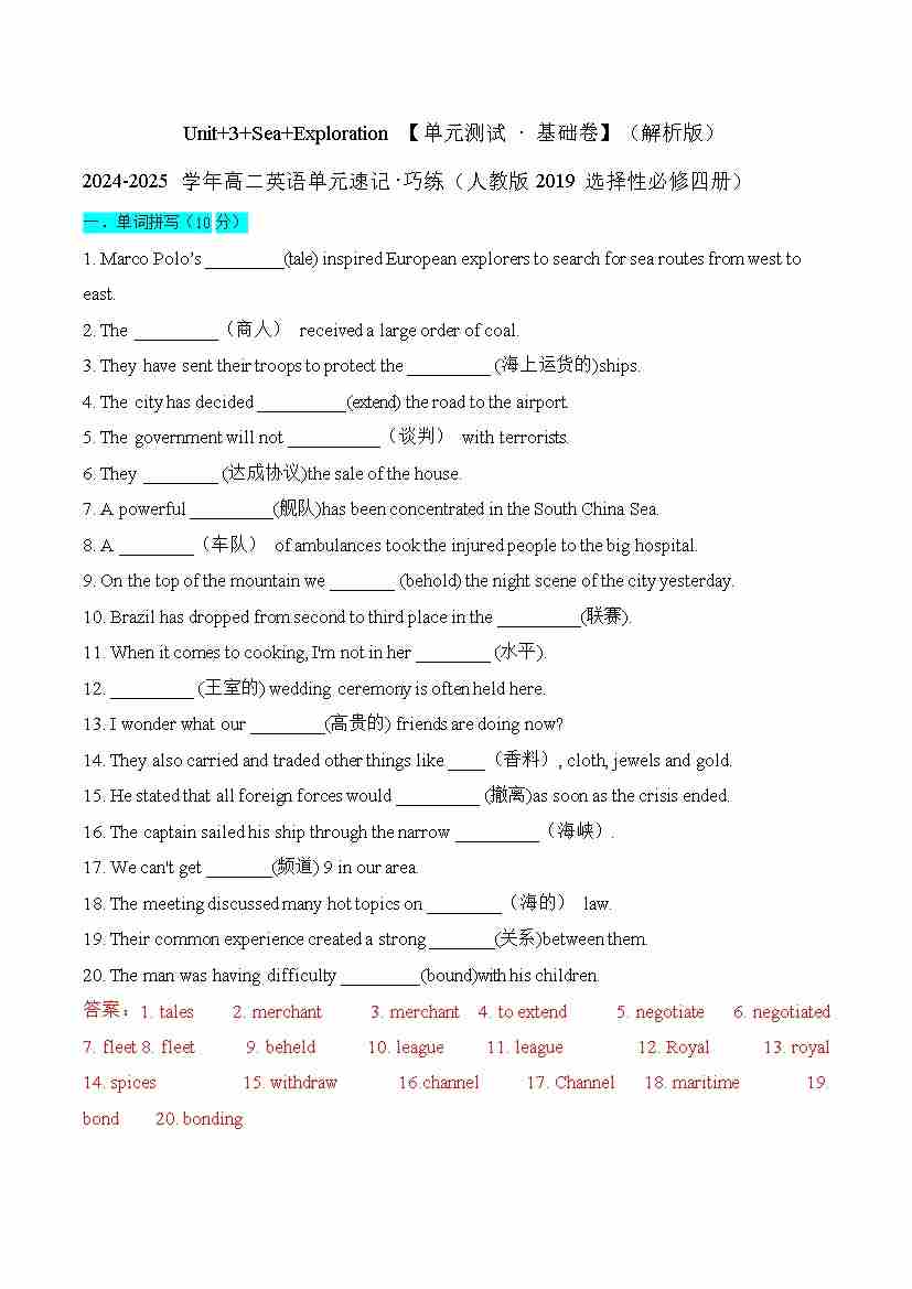 Unit 3 sea exploration(单元测试 · 基础卷)(教师版)