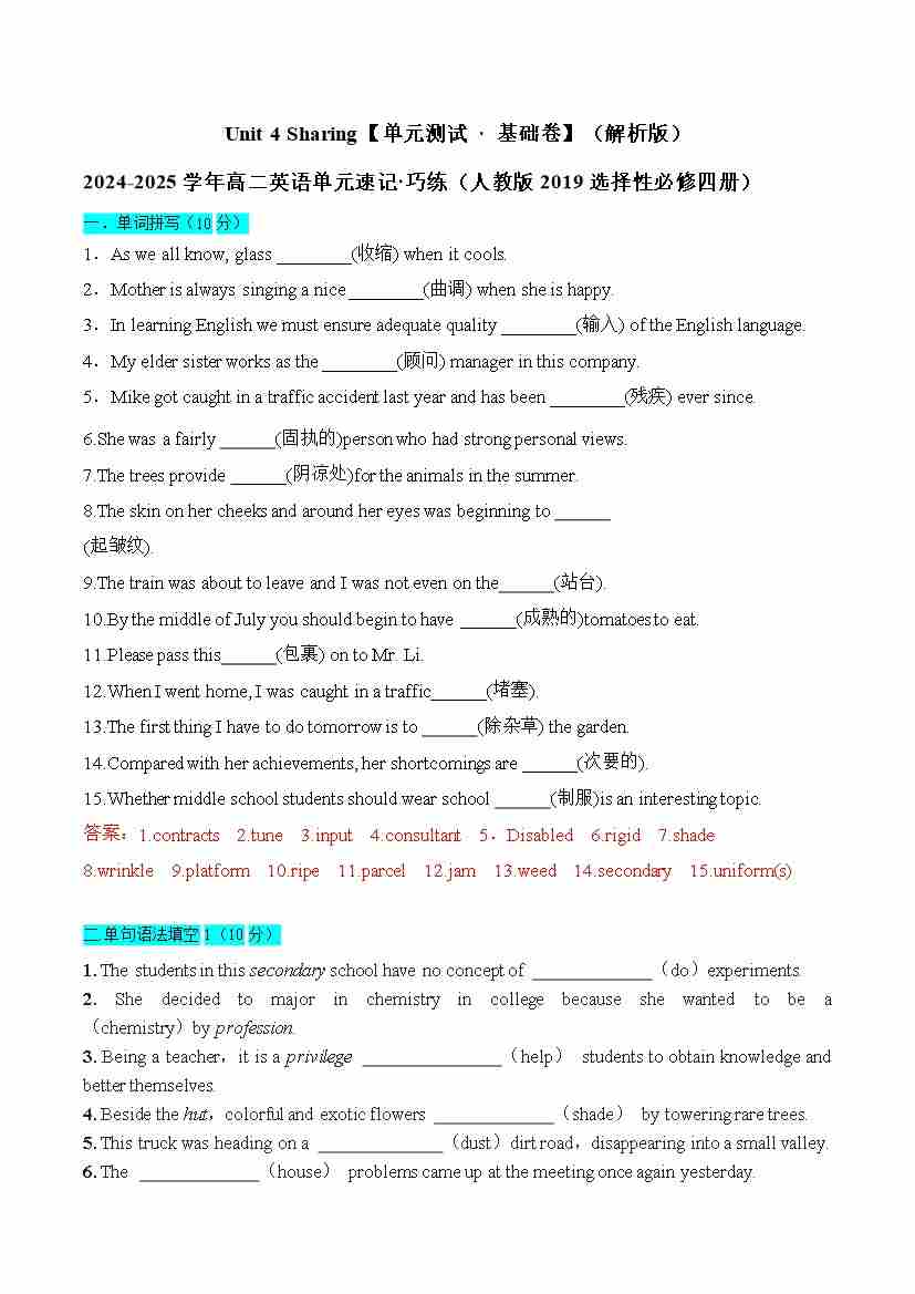 Unit 4 Sharing(单元测试 · 基础卷)(教师版)