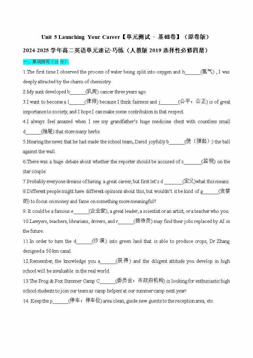 Unit 5 Launching Your Career(单元测试 · 基础卷)(学生版)
