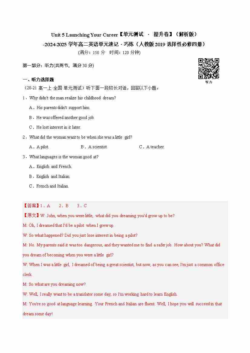 首页 > 全部 > 单元测试 > Unit 5 Launching Your Career(单元测试 · 提升卷)(教师版)