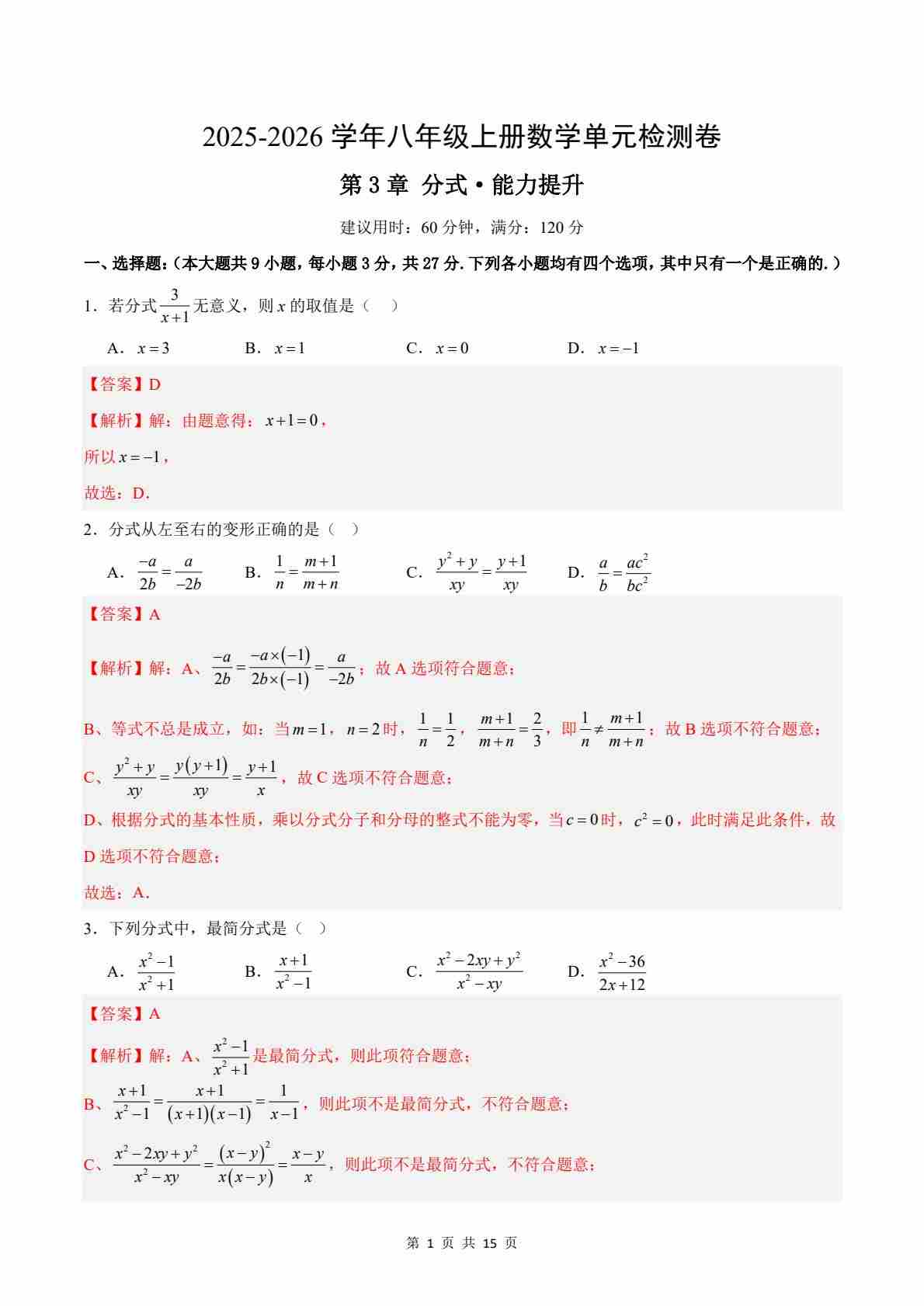 首页 > 全部 > 单元测试 > 第3章 分式测试·提升卷(解析版)