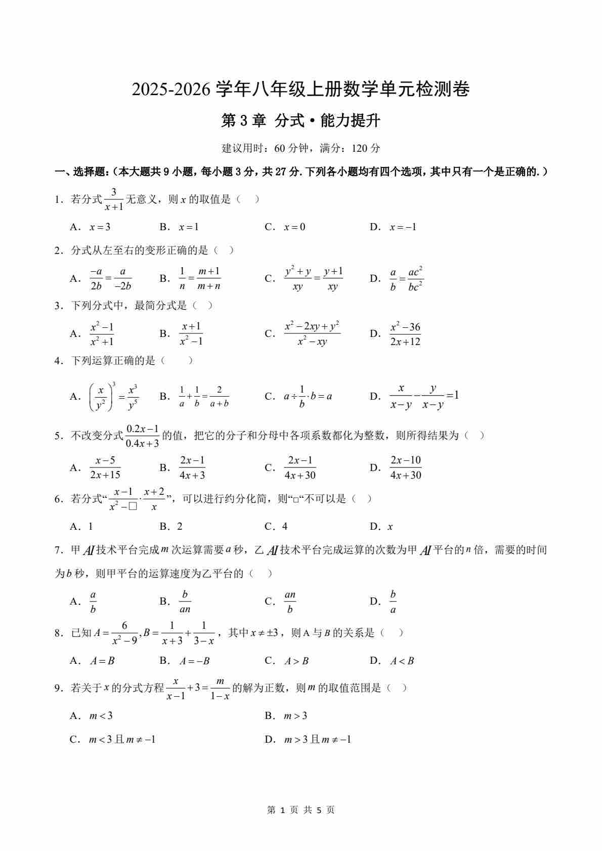 首页 > 全部 > 单元测试 > 第3章 分式测试·提升卷(考试版A4)
