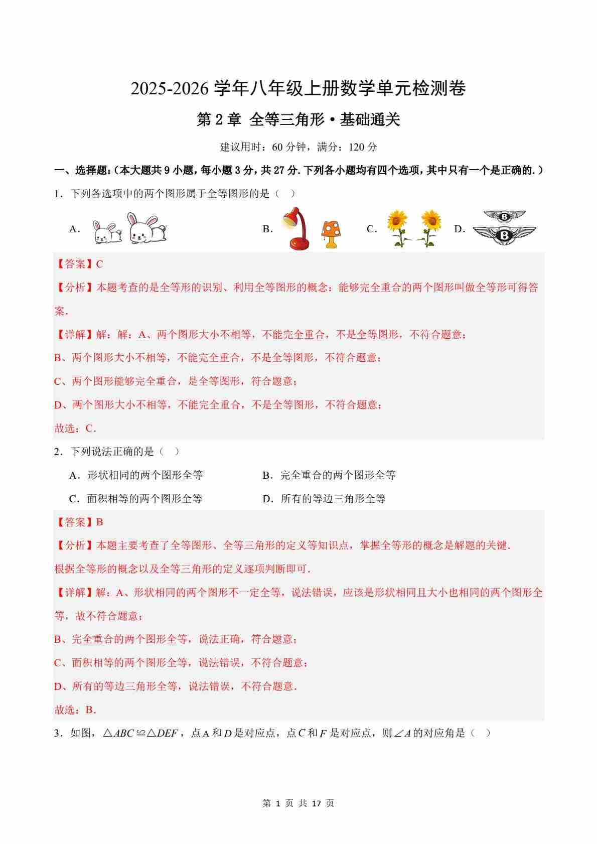 首页 > 全部 > 单元测试 > 第2章 全等三角形测试·基础卷(解析版)
