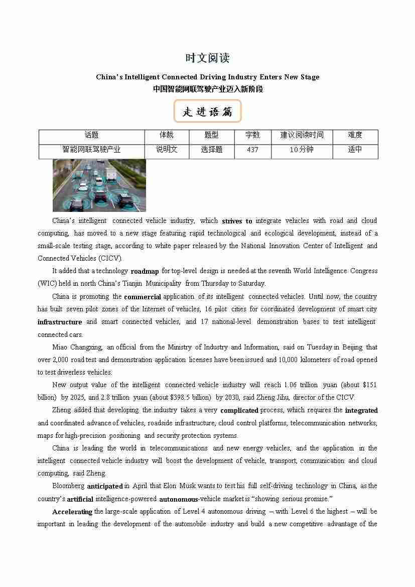 时文阅读05 China's Intelligent Connected Driving Industry Enters New Stage(精练)(话题阅读精练)英语高二通用版