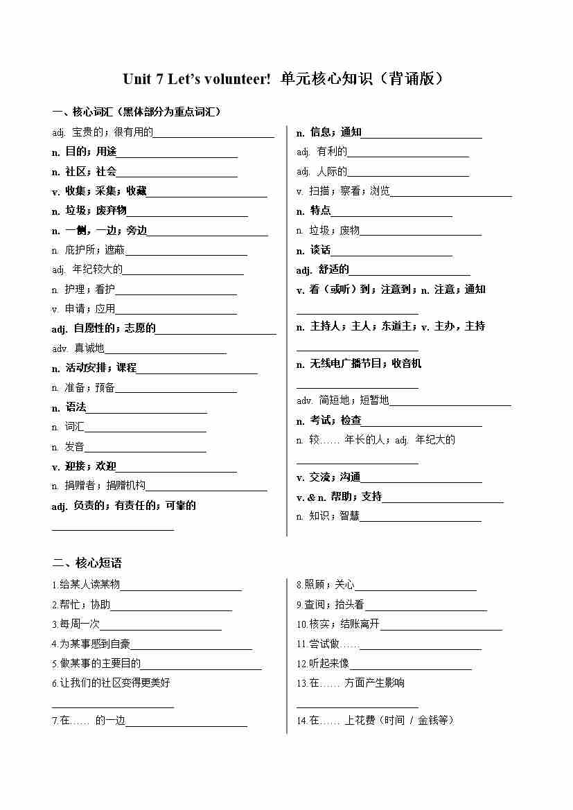 Unit 7 Let’s volunteer! (单元核心知识)(默写版)