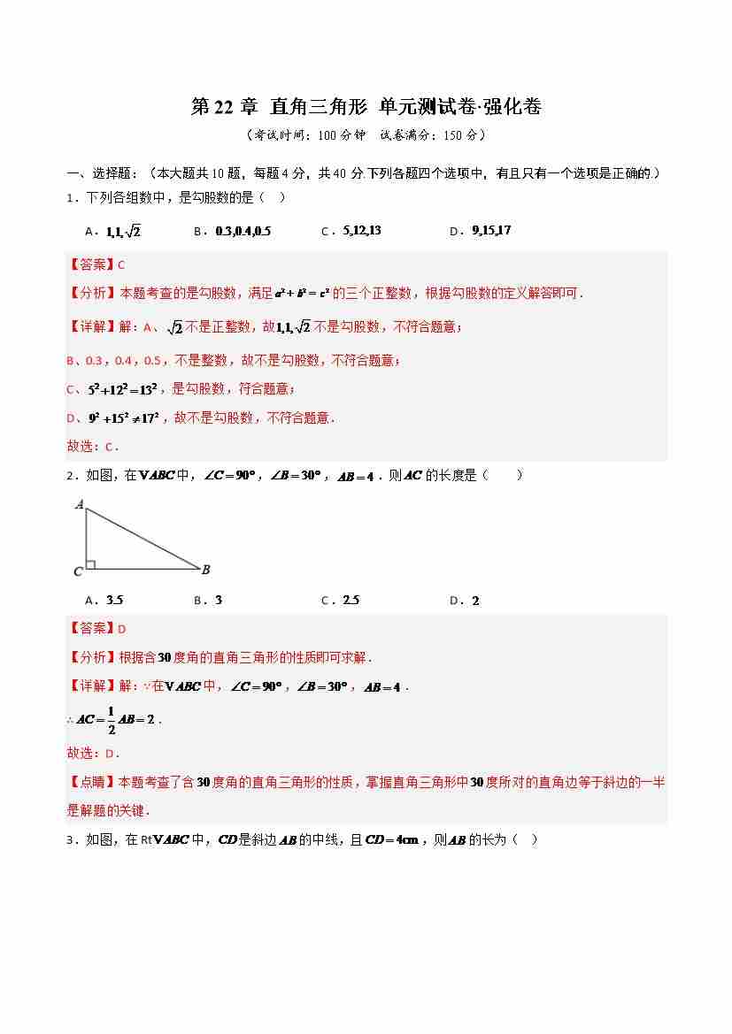 第22章 直角三角形(高效培优单元测试·强化卷)(教师版)