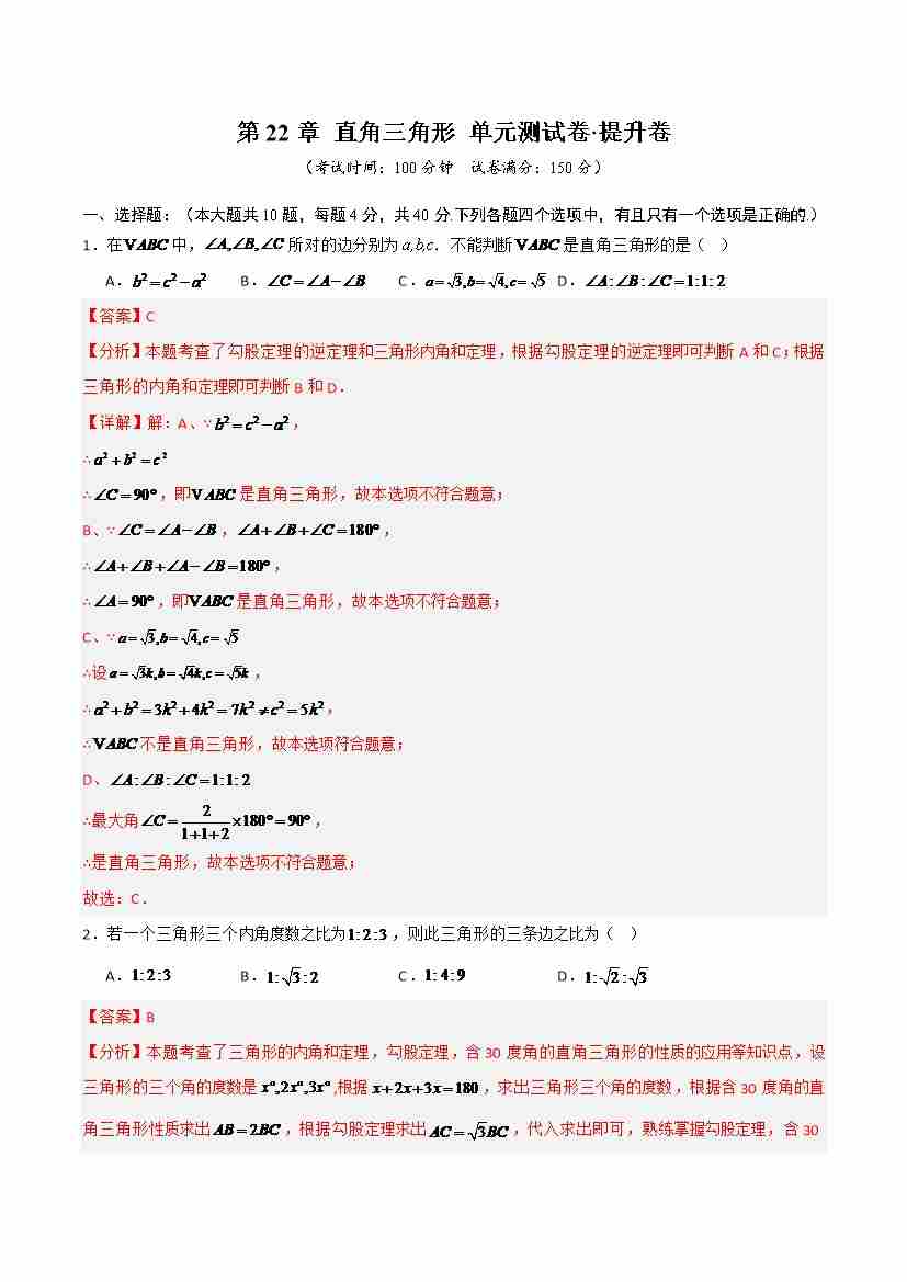 首页 > 全部 > 单元提升卷 > 第22章 直角三角形(高效培优单元测试·提升卷)(教师版)