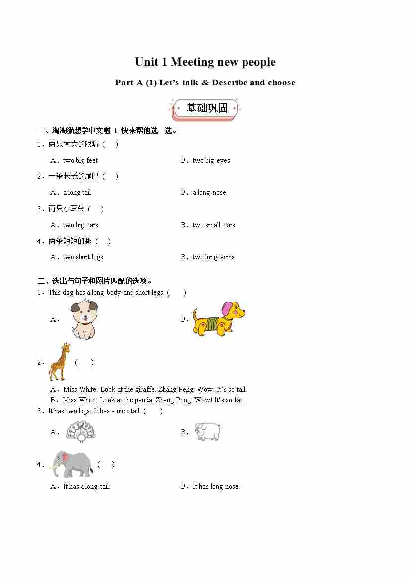三下英语-Unit2(第1课时)Expressing yourself. PartA Let's talk&Describe and choose 同步分层作业(人教PEP版)