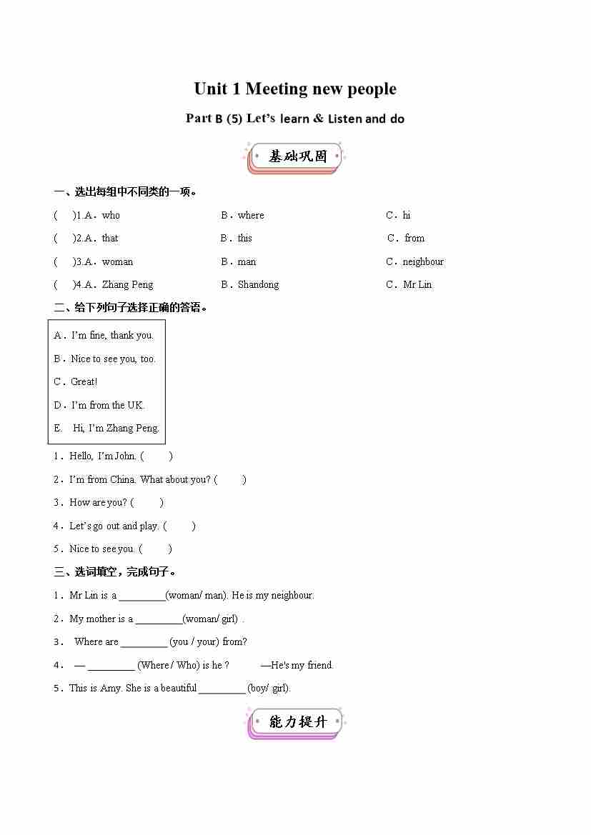 三下英语-Unit1(第5课时)Meeting new people PartB Let's Learn&Listen and do 同步分层作业(人教PEP版)