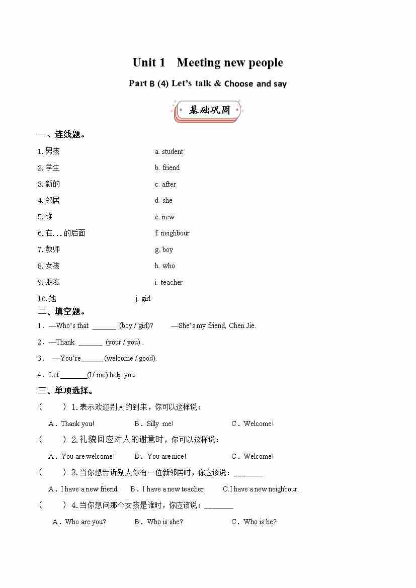 三下英语-Unit1(第4课时)Meeting new people PartB Let's talk&Chose and say 同步分层作业(人教PEP版)