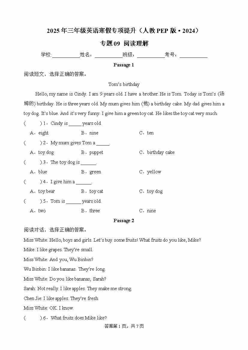 第1部分-寒假复习-专题09 阅读理解(学生版)-2025年三年级英语寒假专项提升(人教PEP版·2024)
