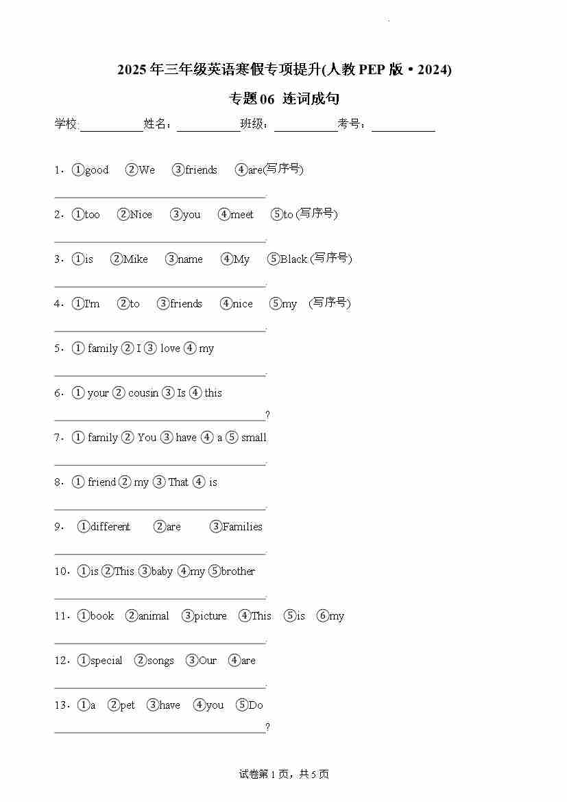 首页 > 全部 > 寒假讲义 > 第1部分-寒假复习-专题06 连词成句(教师版)-2025年三年级英语寒假专项提升(人教PEP版·2024)