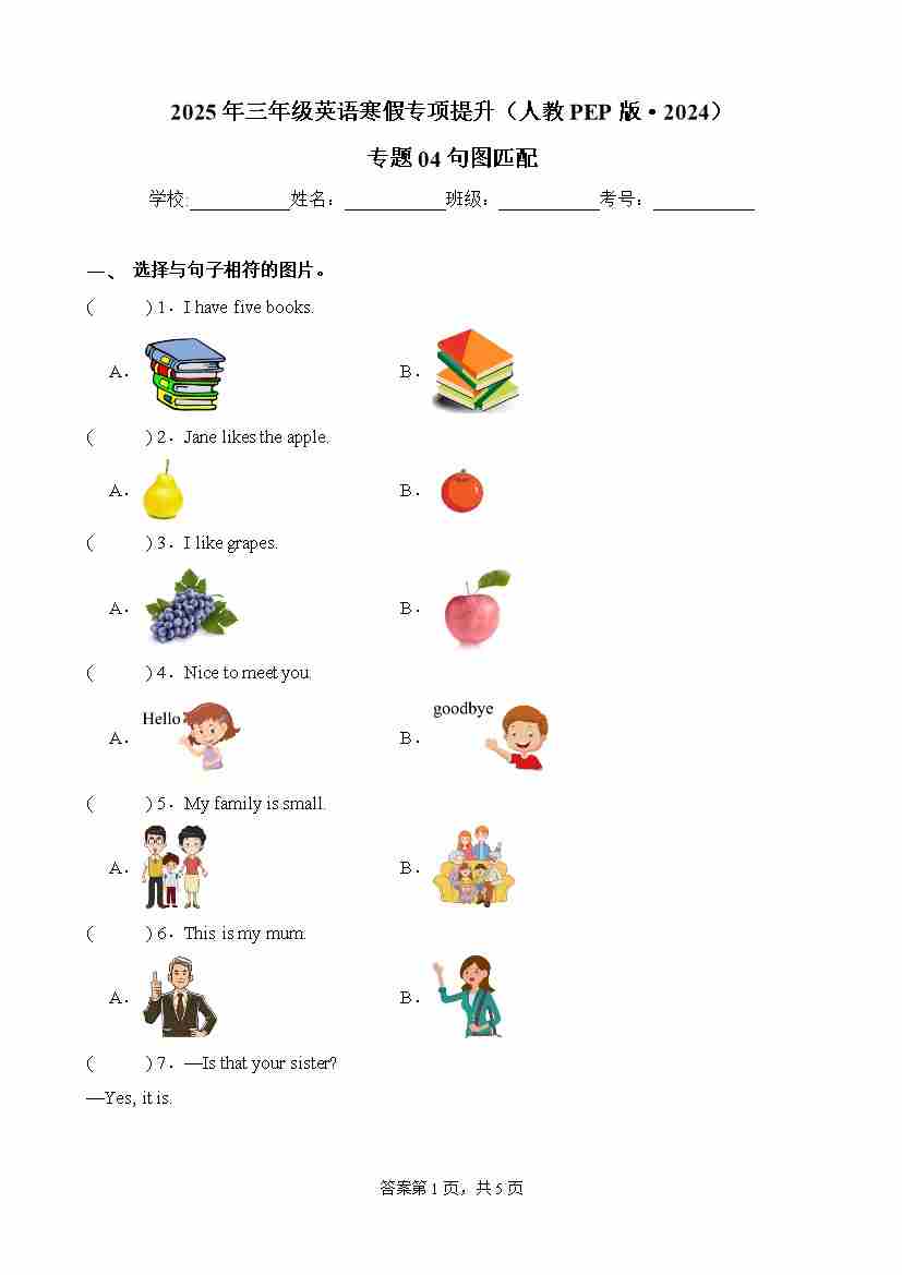 第1部分-寒假复习-专题04 句图匹配(学生版)-2025年三年级英语寒假专项提升(人教PEP版·2024)