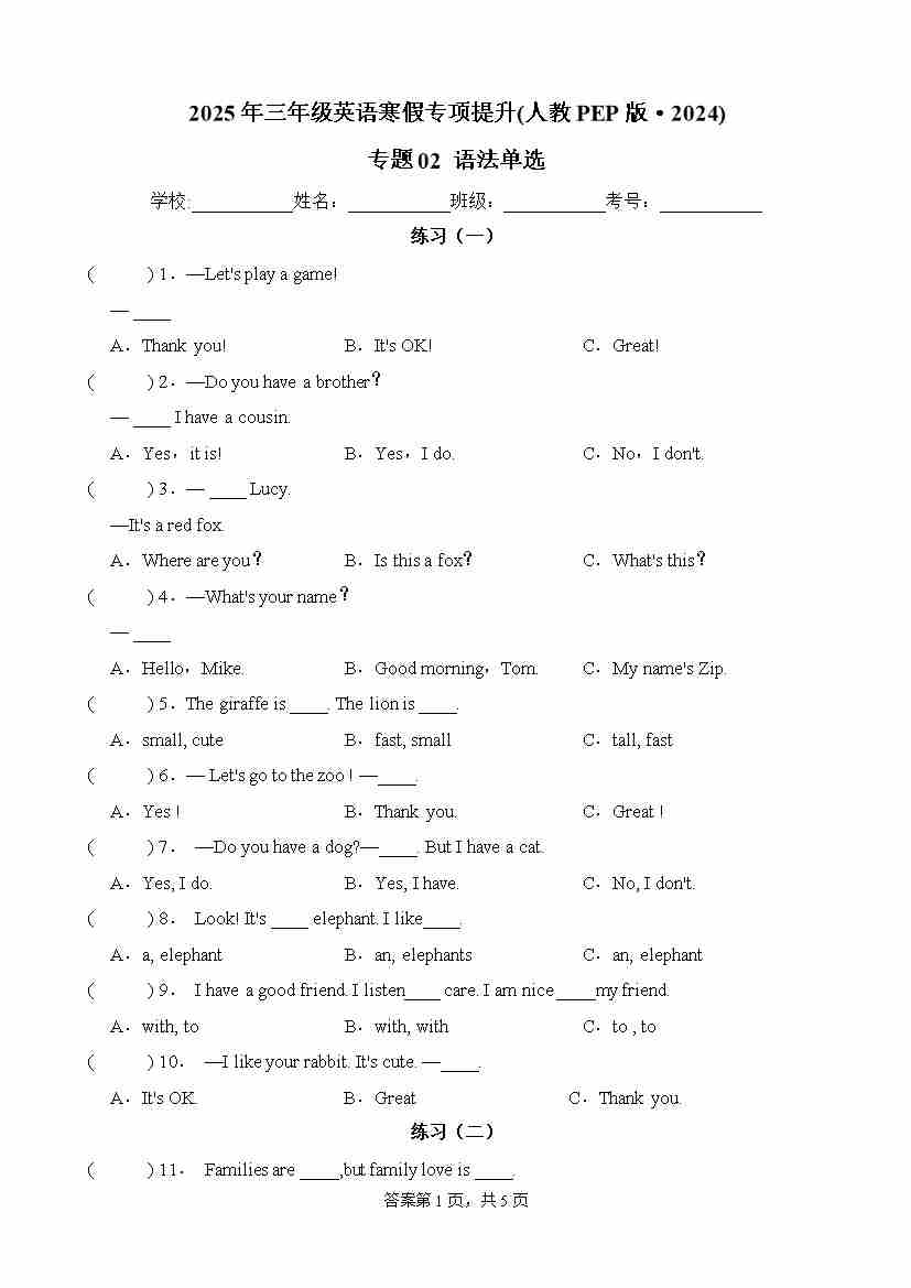 第1部分-寒假复习-专题02 语法单选(学生版)-2025年三年级英语寒假专项提升(人教PEP版·2024)