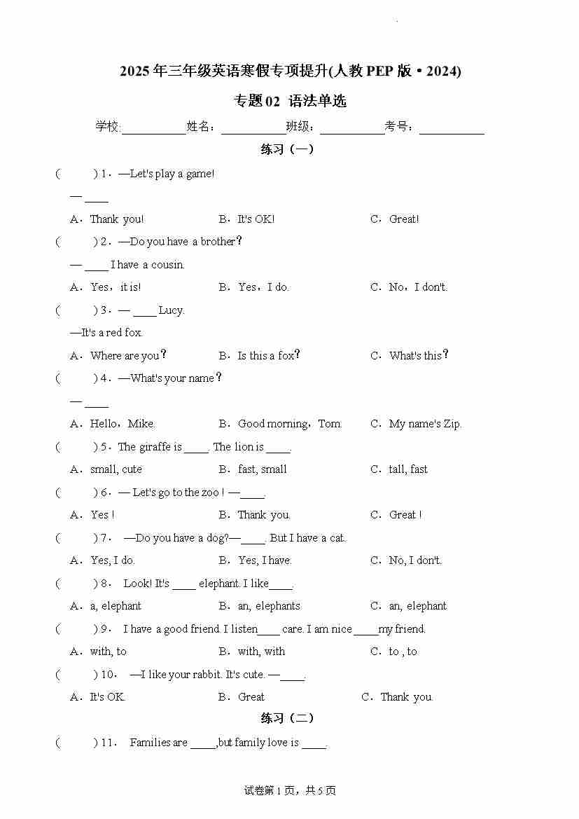 首页 > 全部 > 寒假讲义 > 第1部分-寒假复习-专题02 语法单选(教师版)-2025年三年级英语寒假专项提升(人教PEP版·2024)