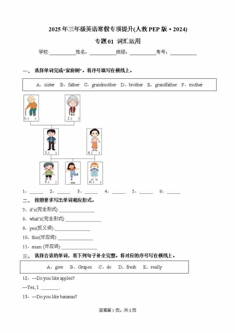 第1部分-寒假复习-专题01 词汇运用(学生版)-2025年三年级英语寒假专项提升(人教PEP版·2024)
