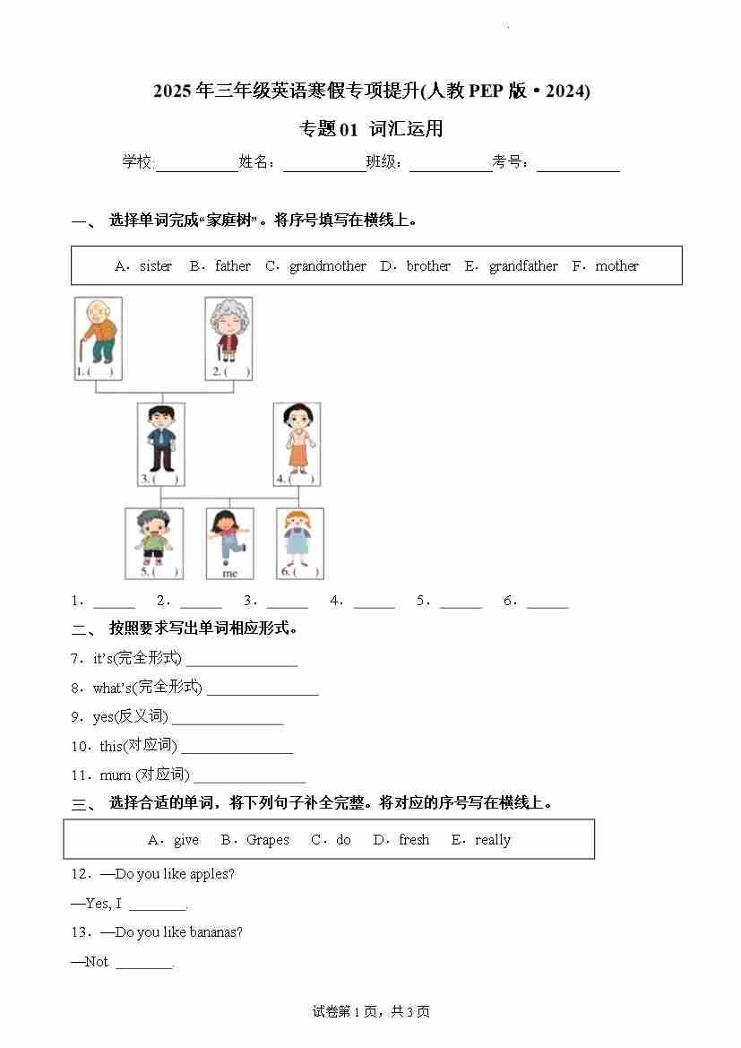 首页 > 全部 > 寒假讲义 > 第1部分-寒假复习-专题01 词汇运用(教师版)-2025年三年级英语寒假专项提升(人教PEP版·2024)