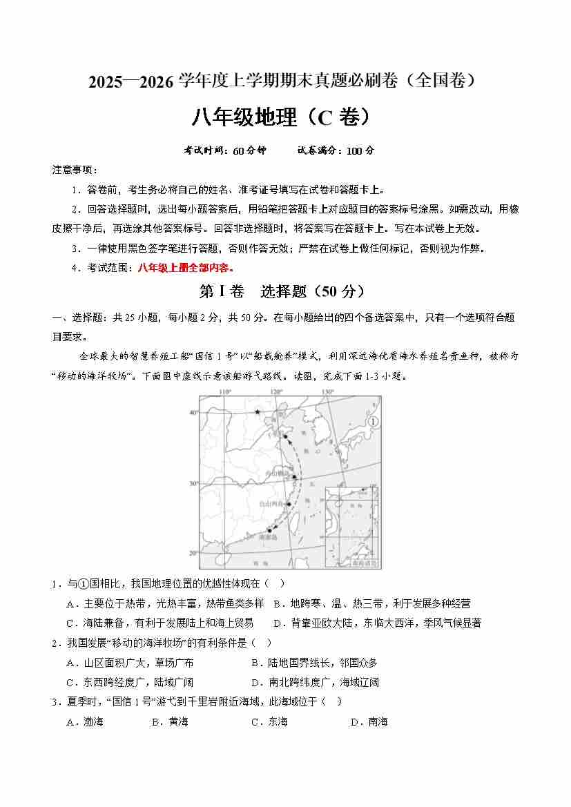 全国卷C(八年级地理·期末真题·必刷卷)-【期末真题·必刷卷】(原卷版)(2)