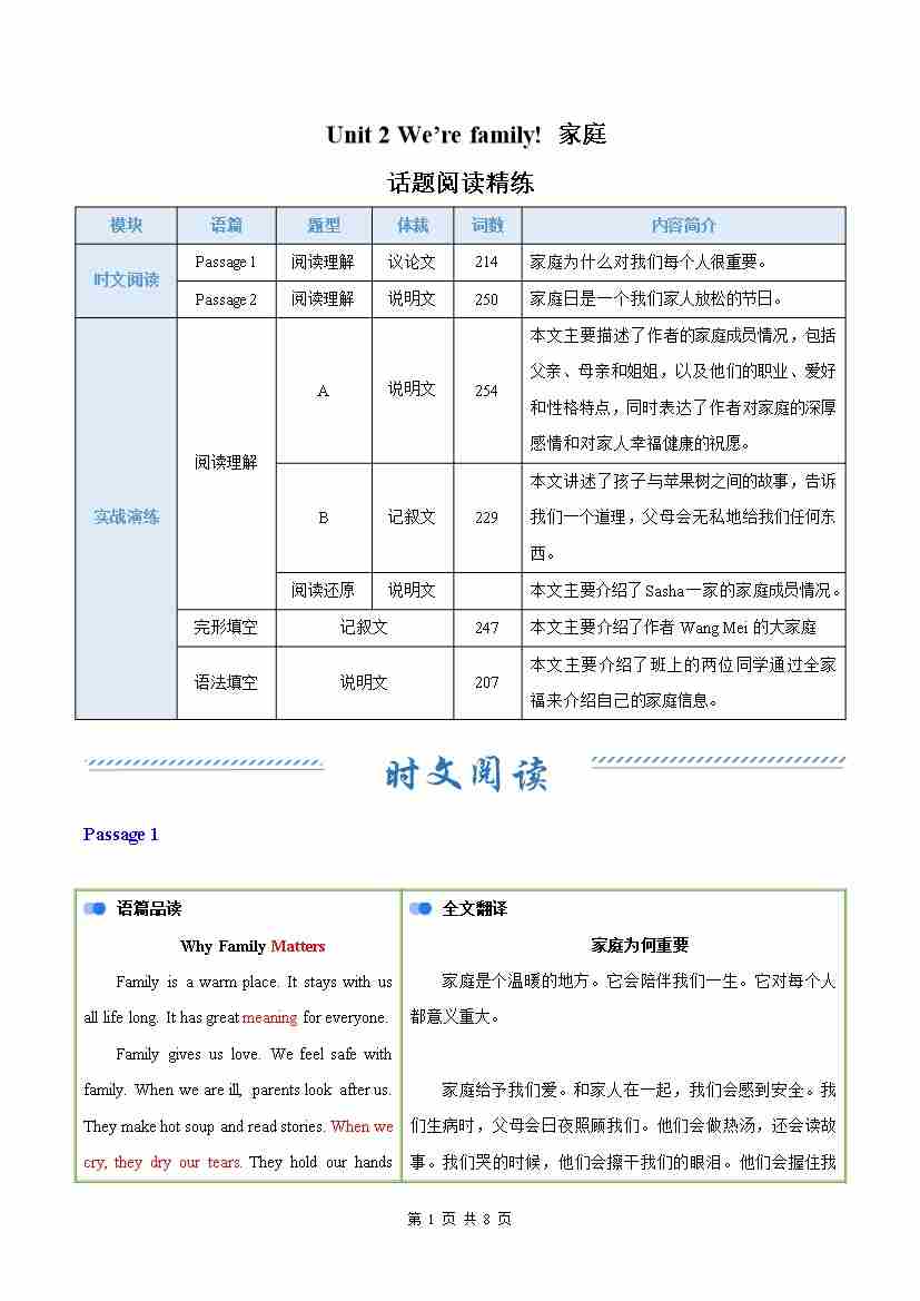 Unit 2 We're family 家庭(话题阅读精练)(原卷版)