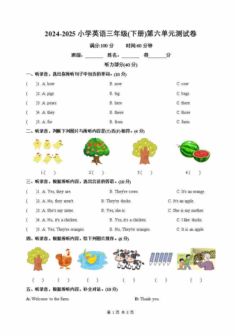 首页 > 全部 > 单元测试 > Unit 6(单元测试) -2024-2025学年英语三年级下册单元速记·巧练系列(译林版三起)