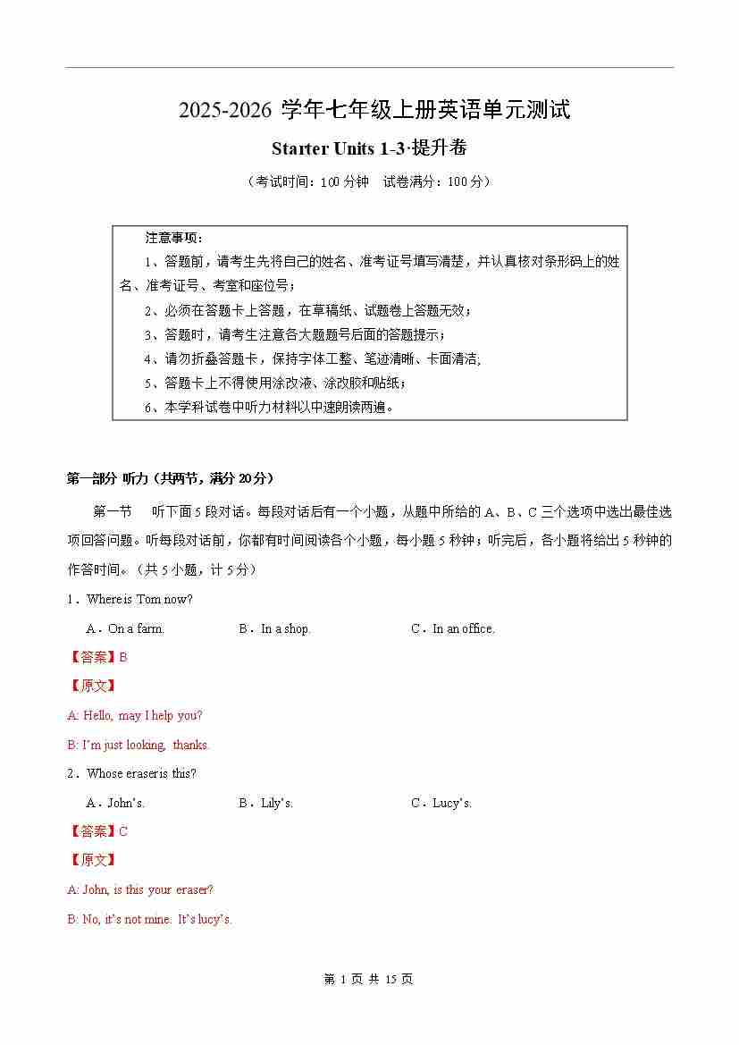 首页 > 全部 > 单元提升卷 > 七年级英语上册Starter Units 1-3 单元测试·提升卷(解析版)