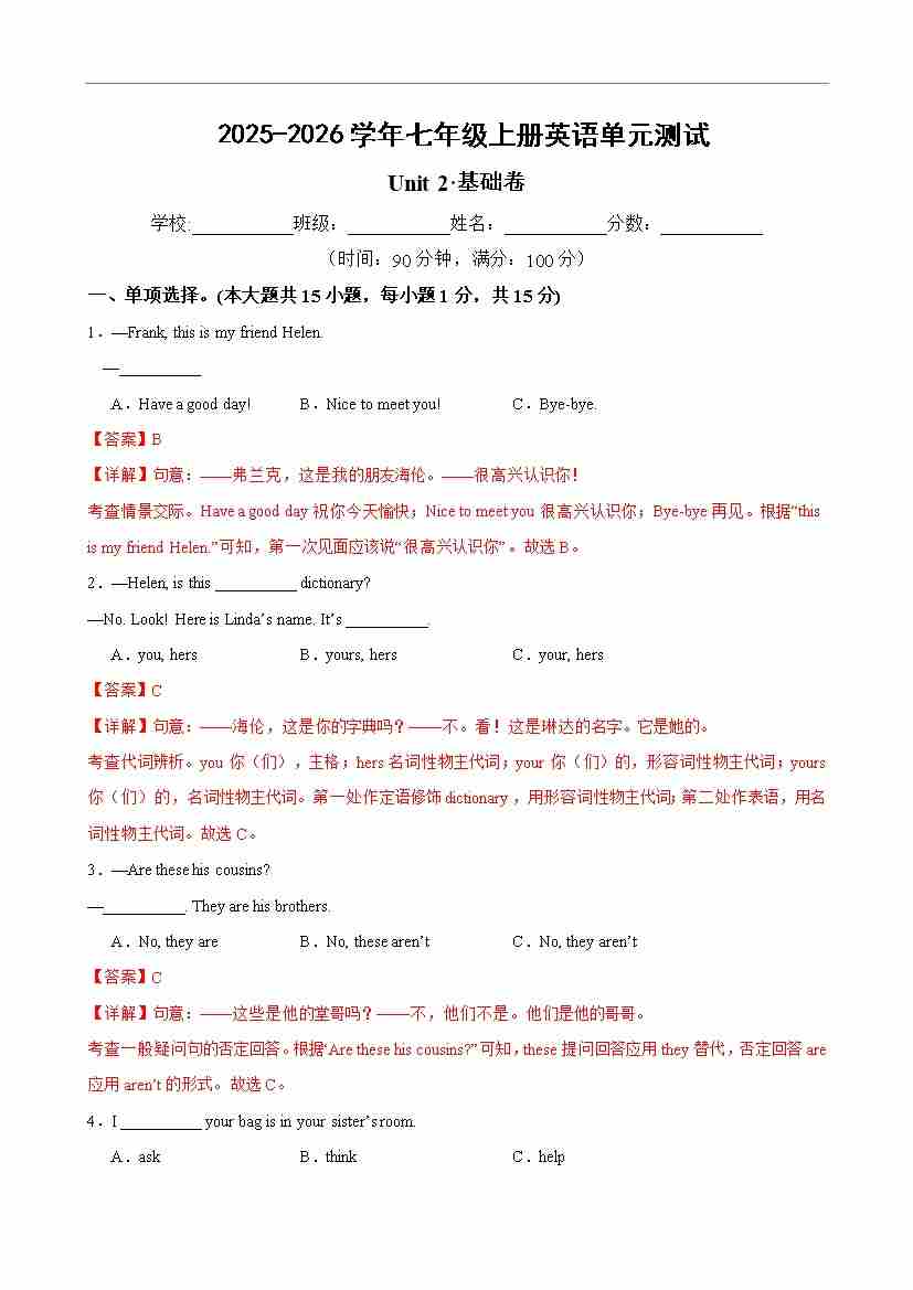 首页 > 全部 > 单元提升卷 > 七年级英语上册 Unit 2 单元测试·基础卷(解析版)