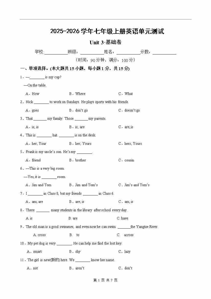 首页 > 全部 > 单元提升卷 > 七年级英语上册 Unit 3 单元测试·基础卷(考试版A4)
