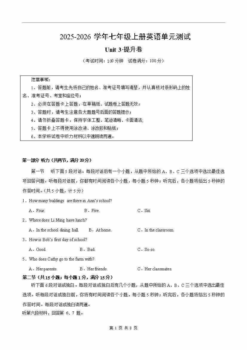 首页 > 全部 > 单元提升卷 > 七年级英语上册 Unit 3 单元测试·提升卷(考试版A4)