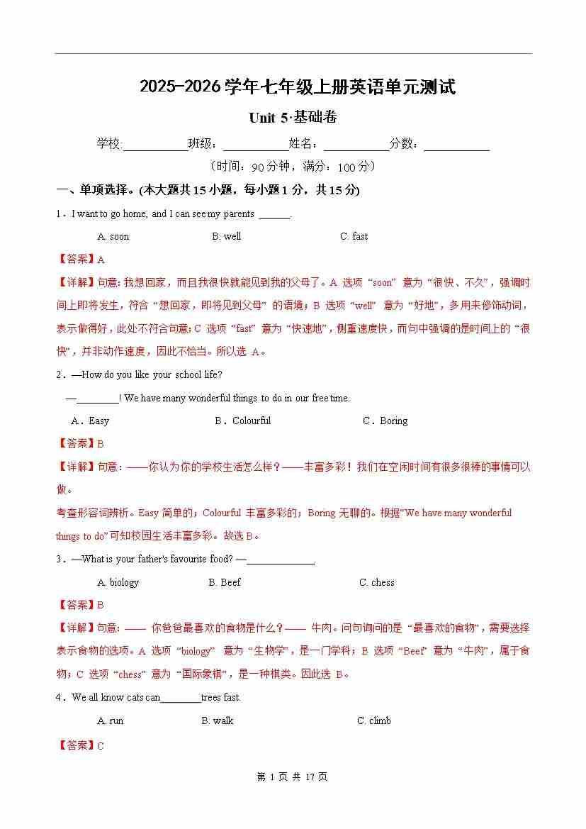 首页 > 全部 > 单元提升卷 > 七年级英语上册 Unit 5 单元测试·基础卷(解析版)