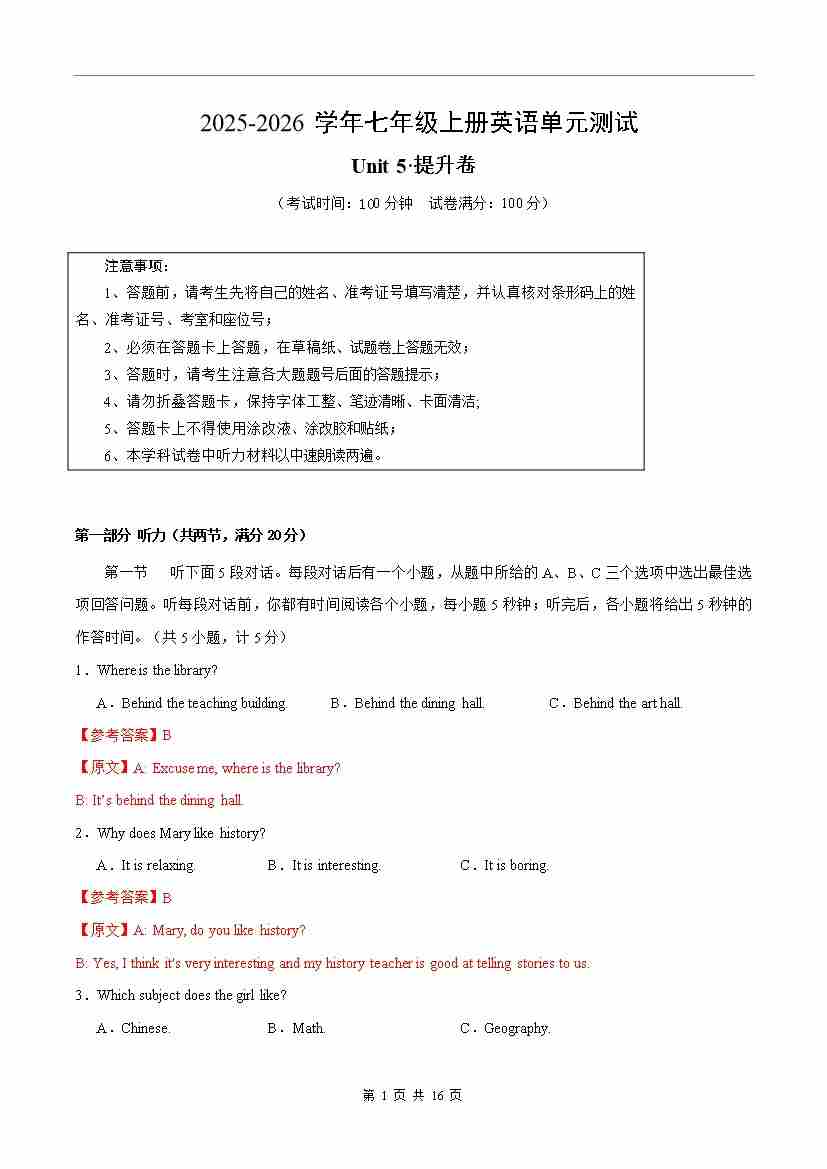 七年级英语上册 Unit 5 单元测试·提升卷(解析版)
